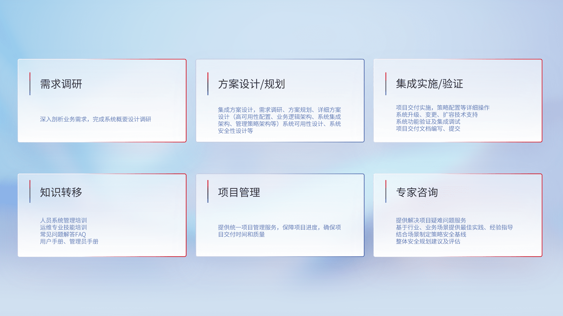 针对客户行业特性,,,,将宏观的安全战略和需求,,,通过专业的交付服务,,,,实现项目落地,,,,为客户提供标准规范的集成交付服务。。。